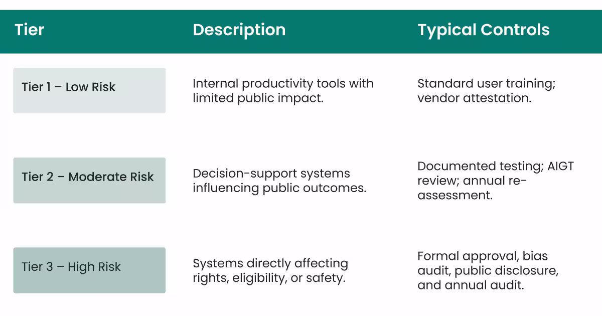 By publishing this model, the goal is not to prescribe a one-size-fits-all solution, but to help every public agency—large or small—adopt A.I. tools confidently and responsibly. The guiding principle is scalability: A.I. governance should always match an agency’s mission, capacity, and level of public impact.